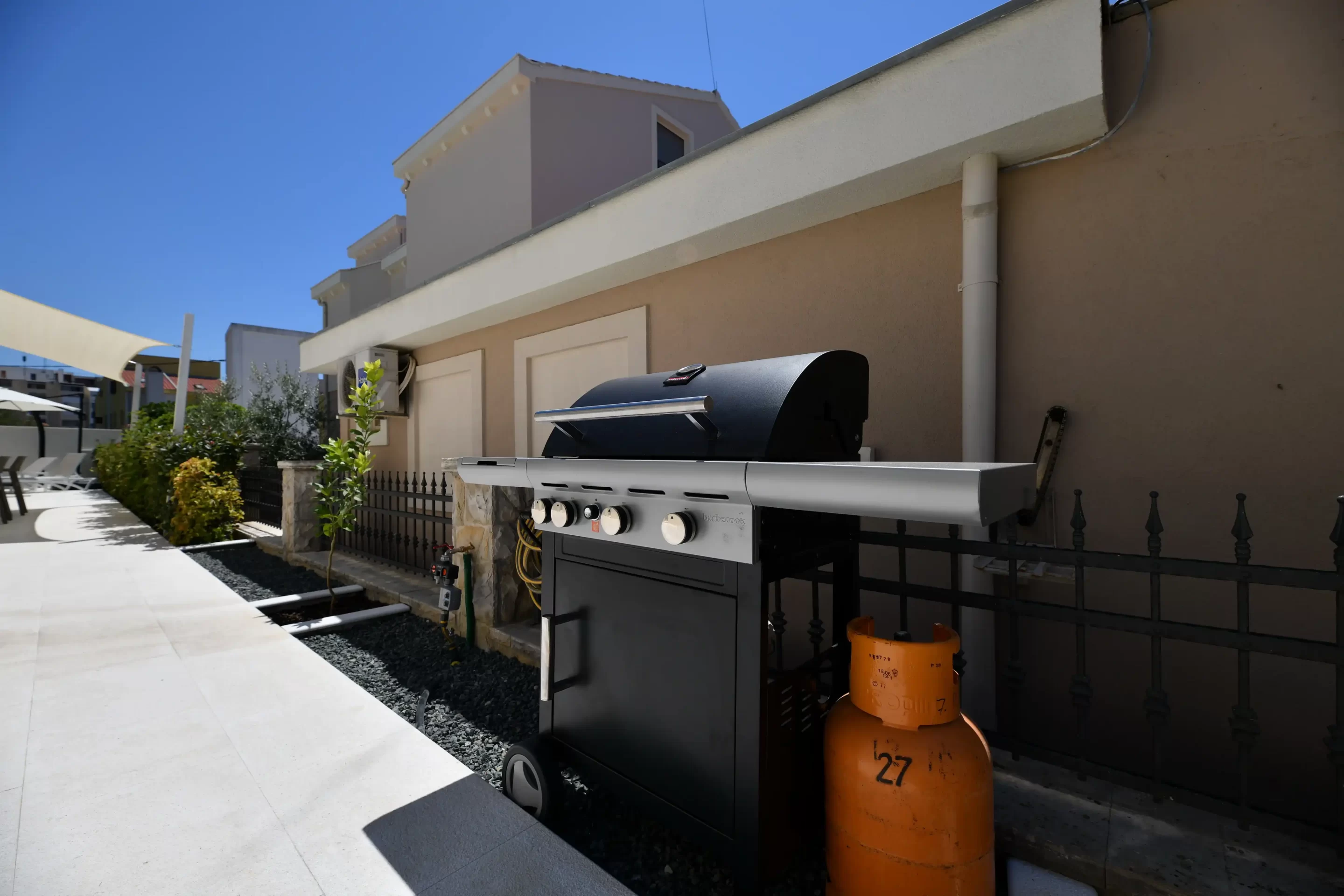 You will sunbathe on 6 deck chairs, you can also use the outdoor gas grill and dine on the outdoor dining table. You will be able to drink your morning coffee on the outdoor seating set, which includes a coffee table.