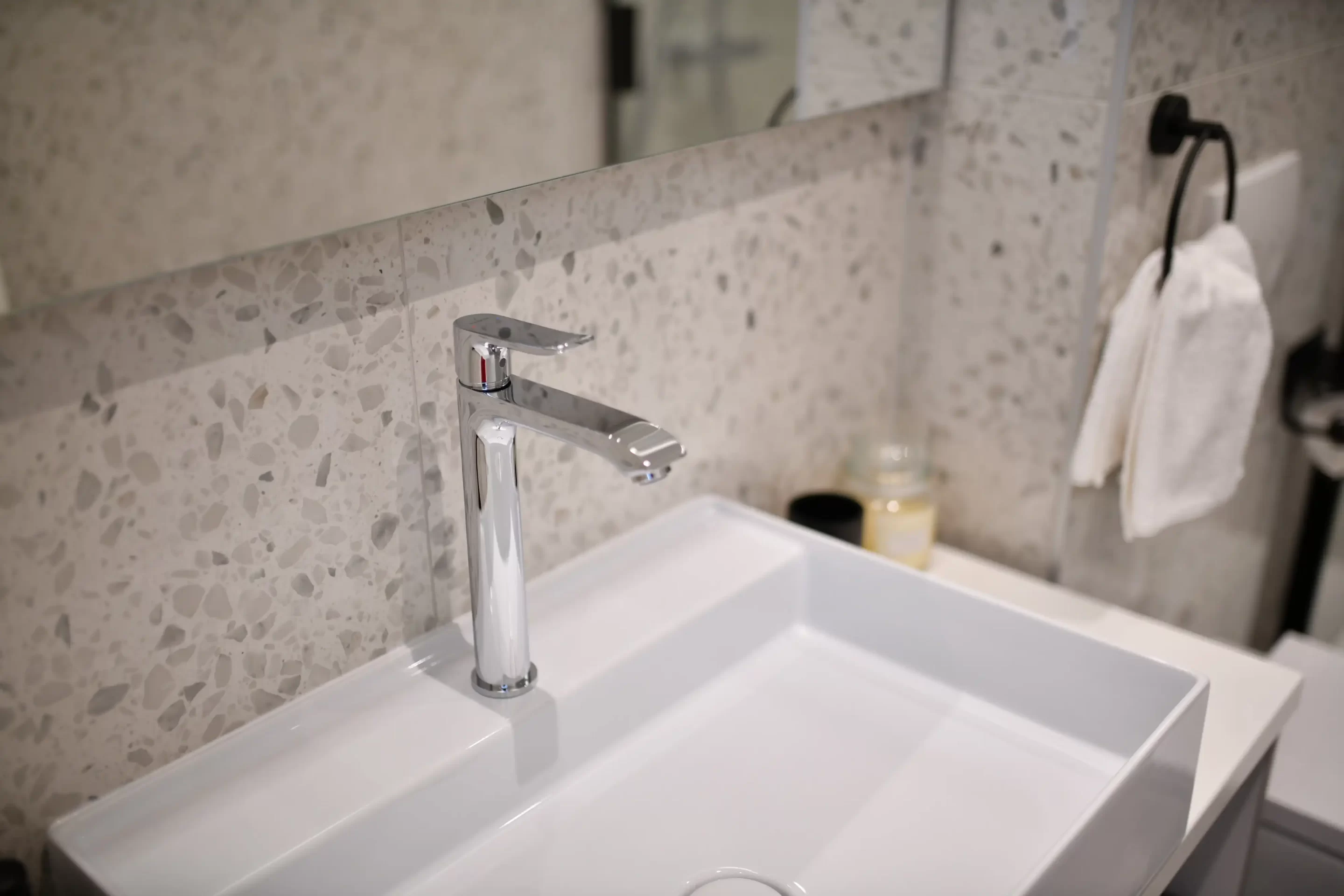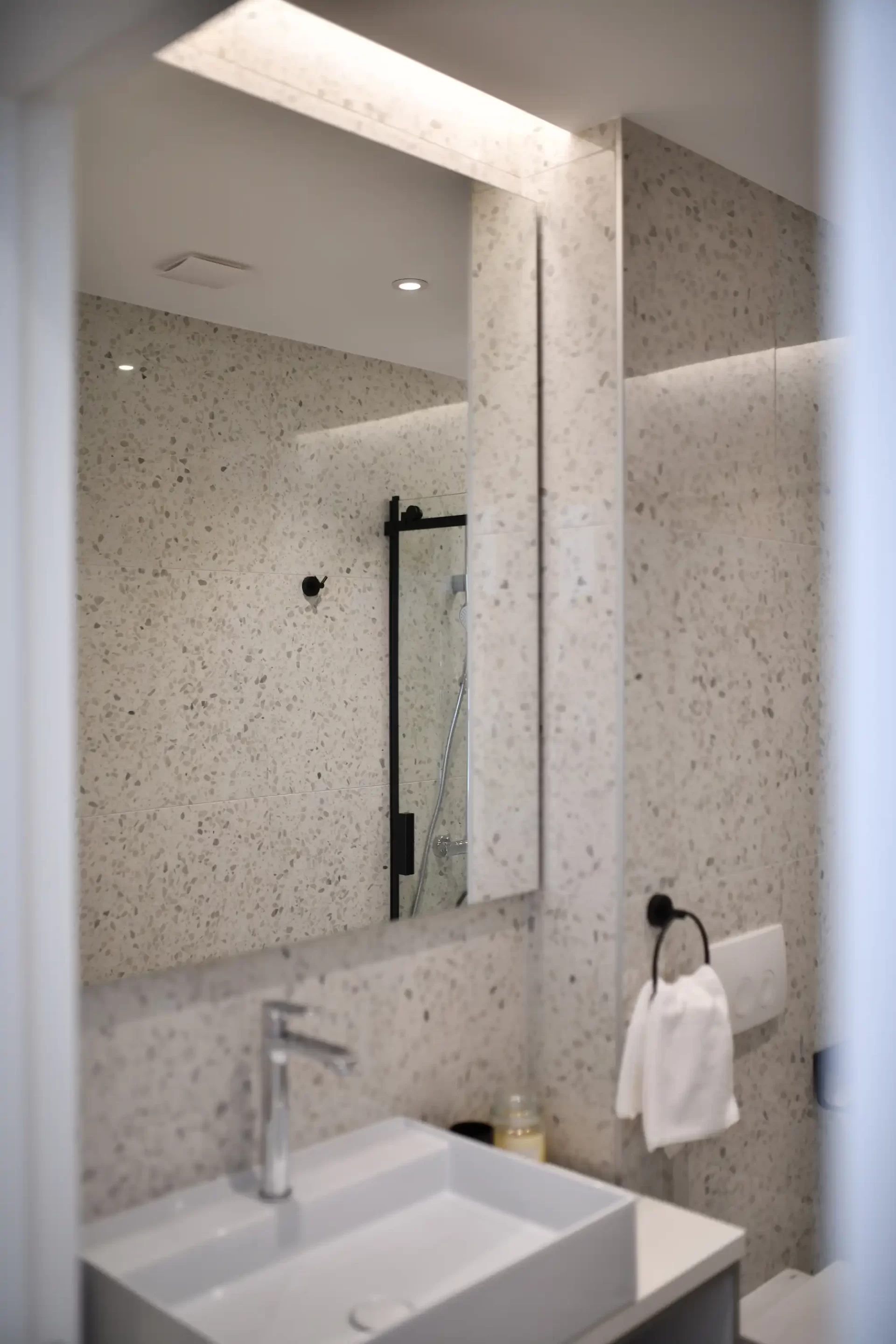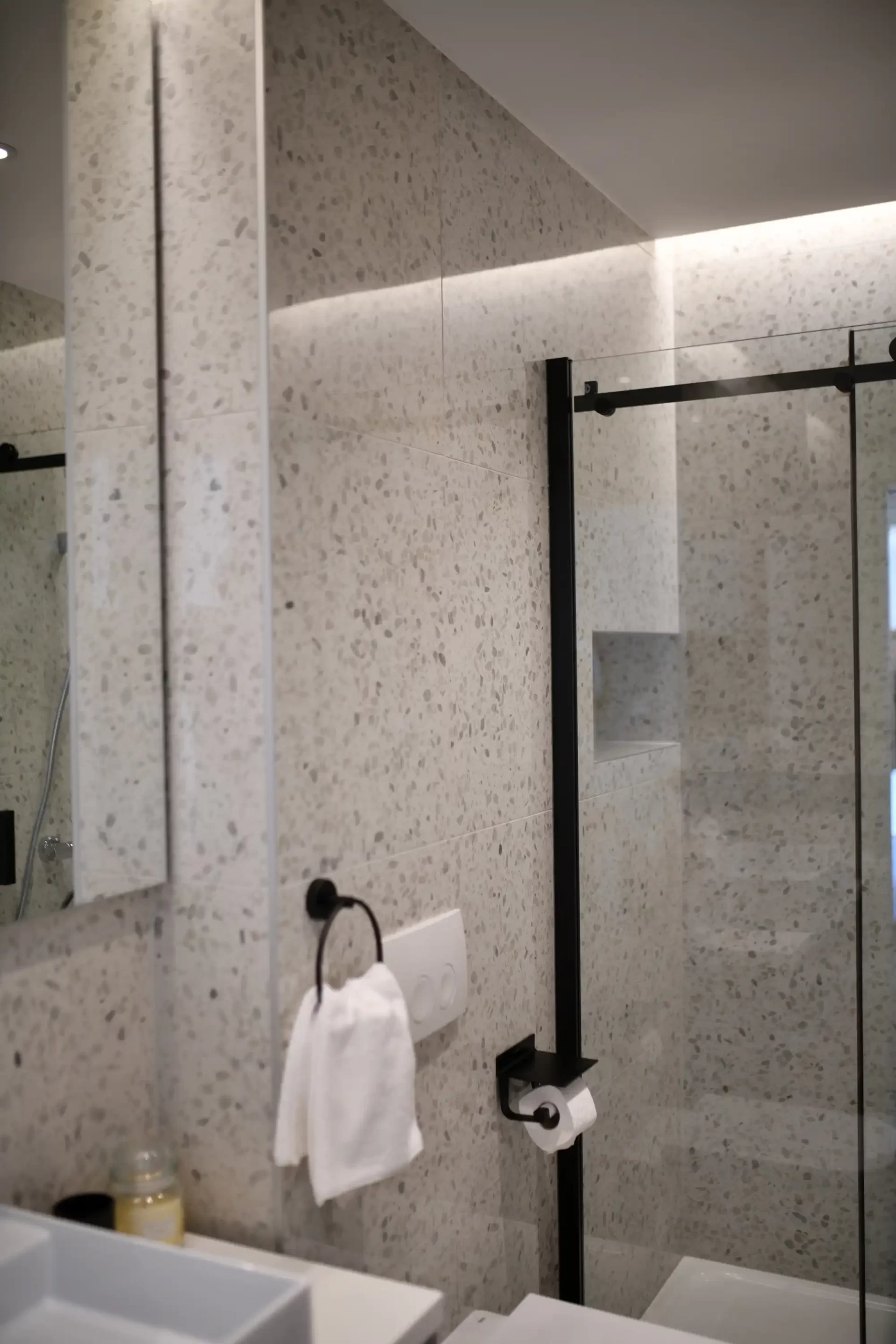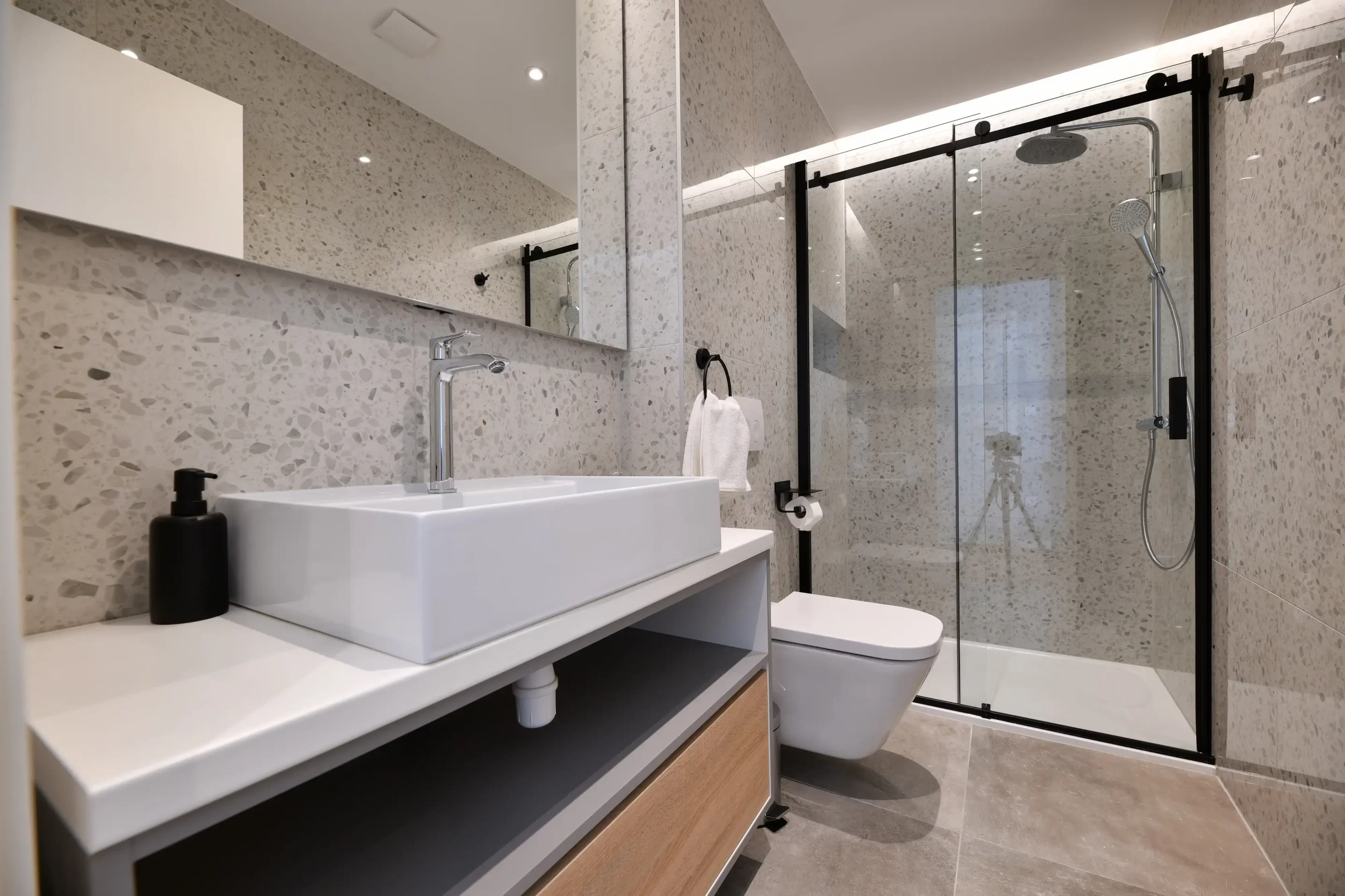 There are 3 bedrooms, 2 with double beds, one of which has an en suite bathroom with shower, and there are two more ordinary bathrooms, also with showers. There is also a TV in each bedroom.