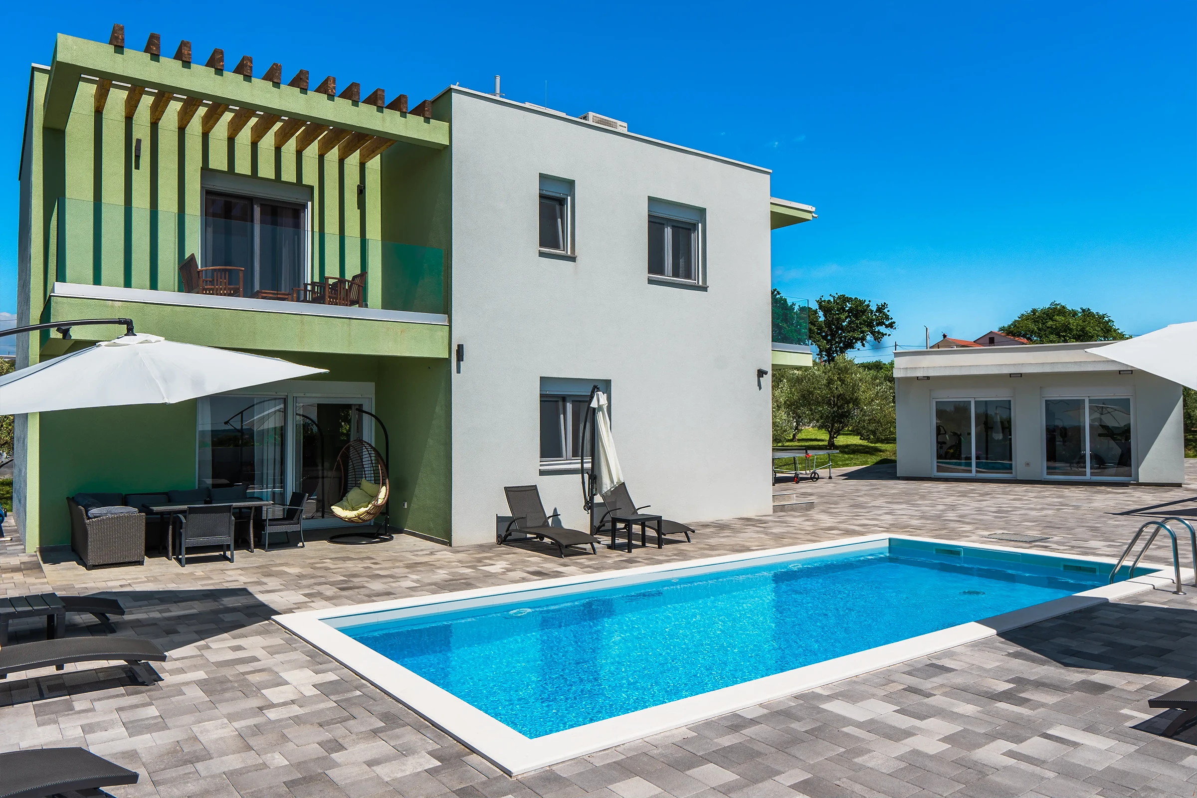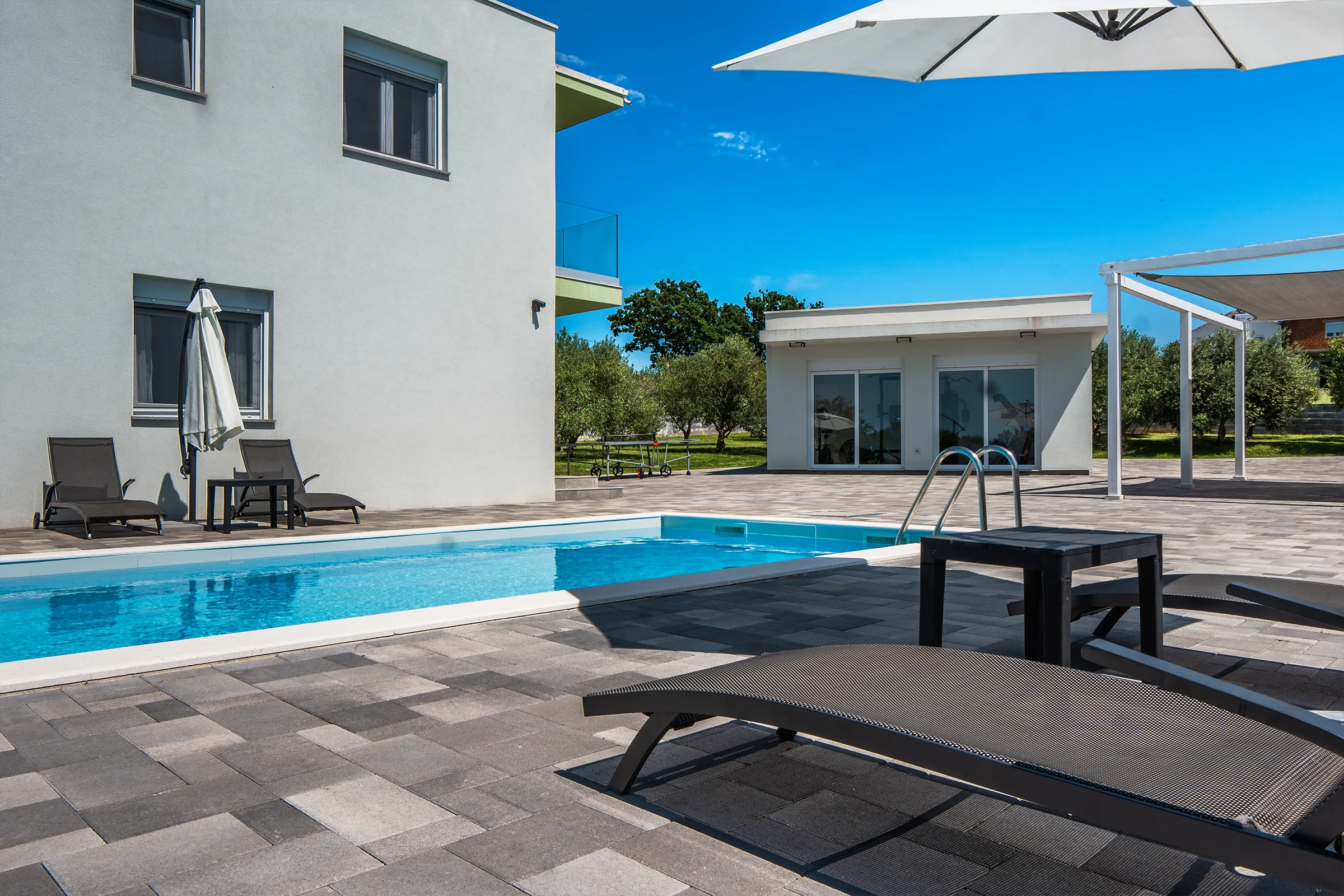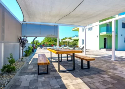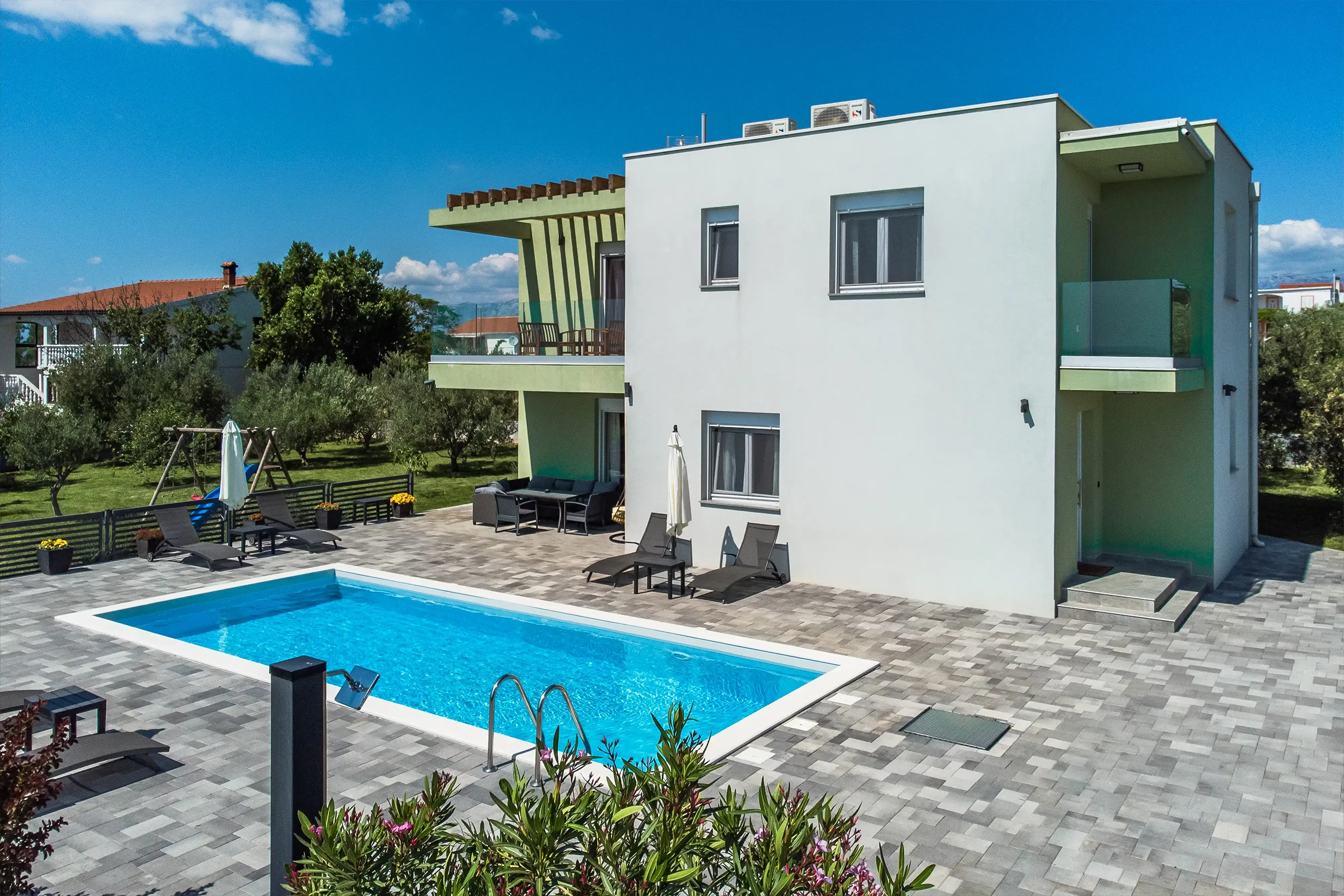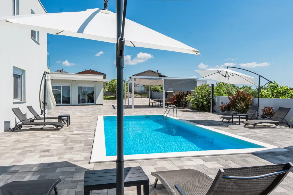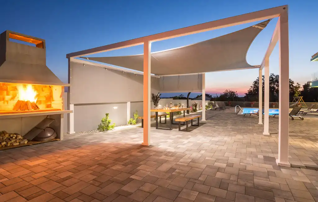 Nin Holiday Home is located in a small village Vrsi next to the picturesque town of Nin. Villa consists of a fully equipped kitchen (gas stove, oven, refrigerator with freezer, coffee machine ..), dining room and living room in one space. The living room is equipped with TV. Upstairs are 3 bedrooms with double beds and 3 bathrooms with shower, there is also a washing machine. In the outer part there is a pool with garden furniture and fenced garden with grill.