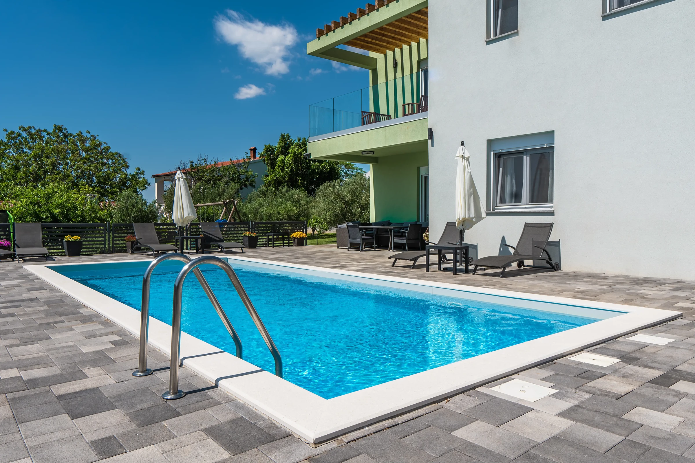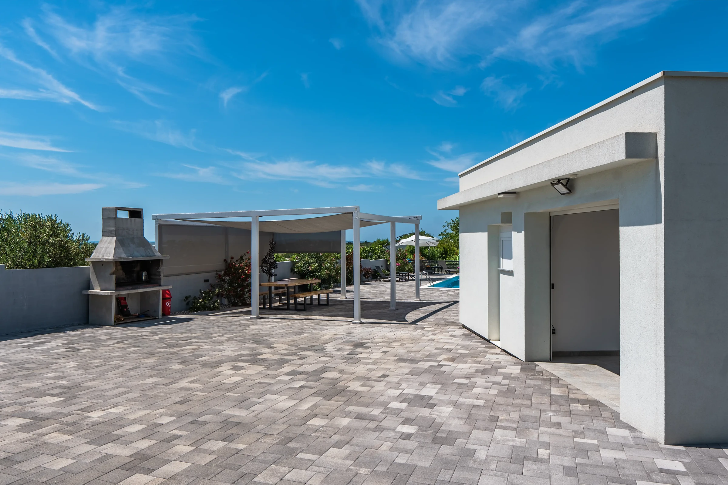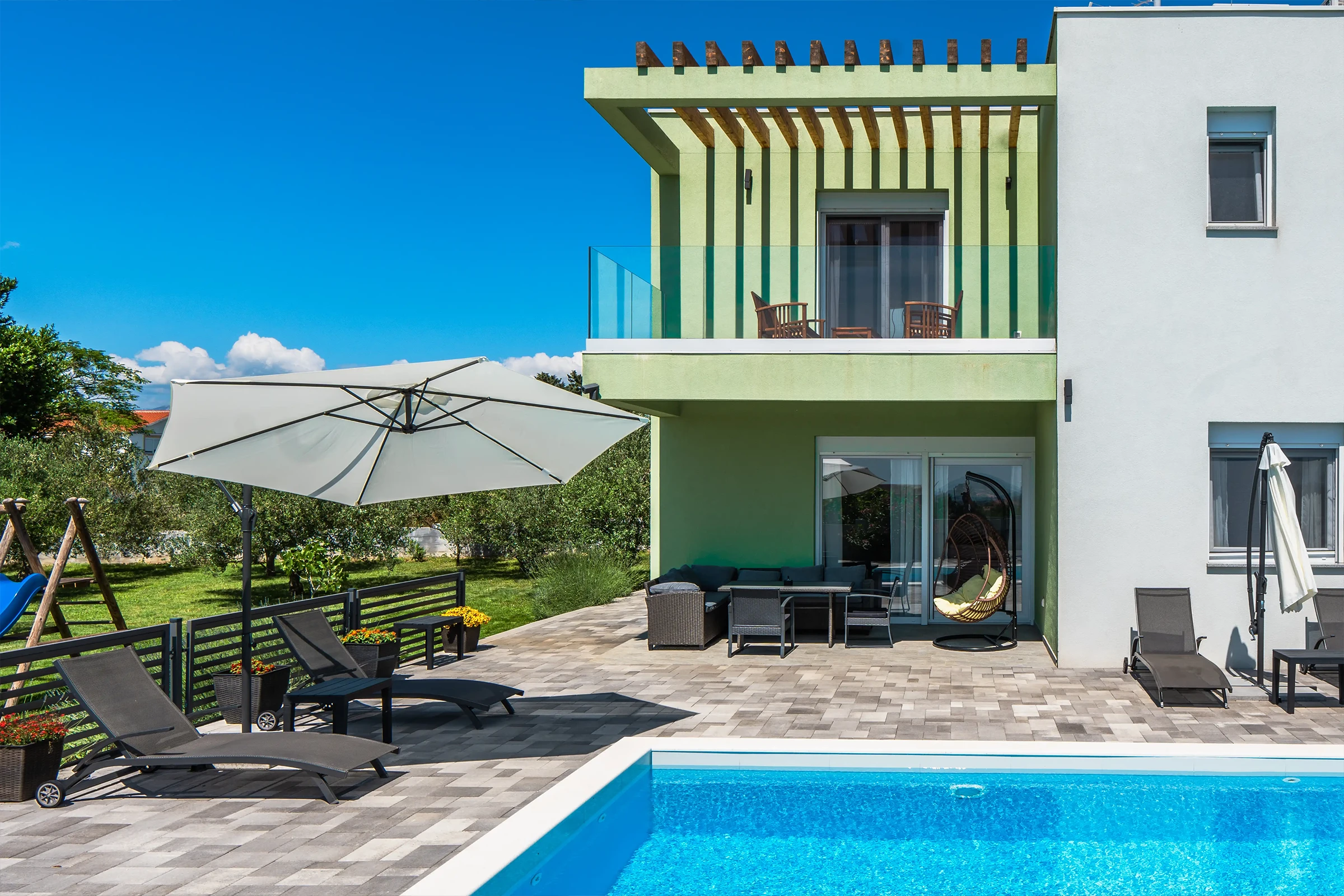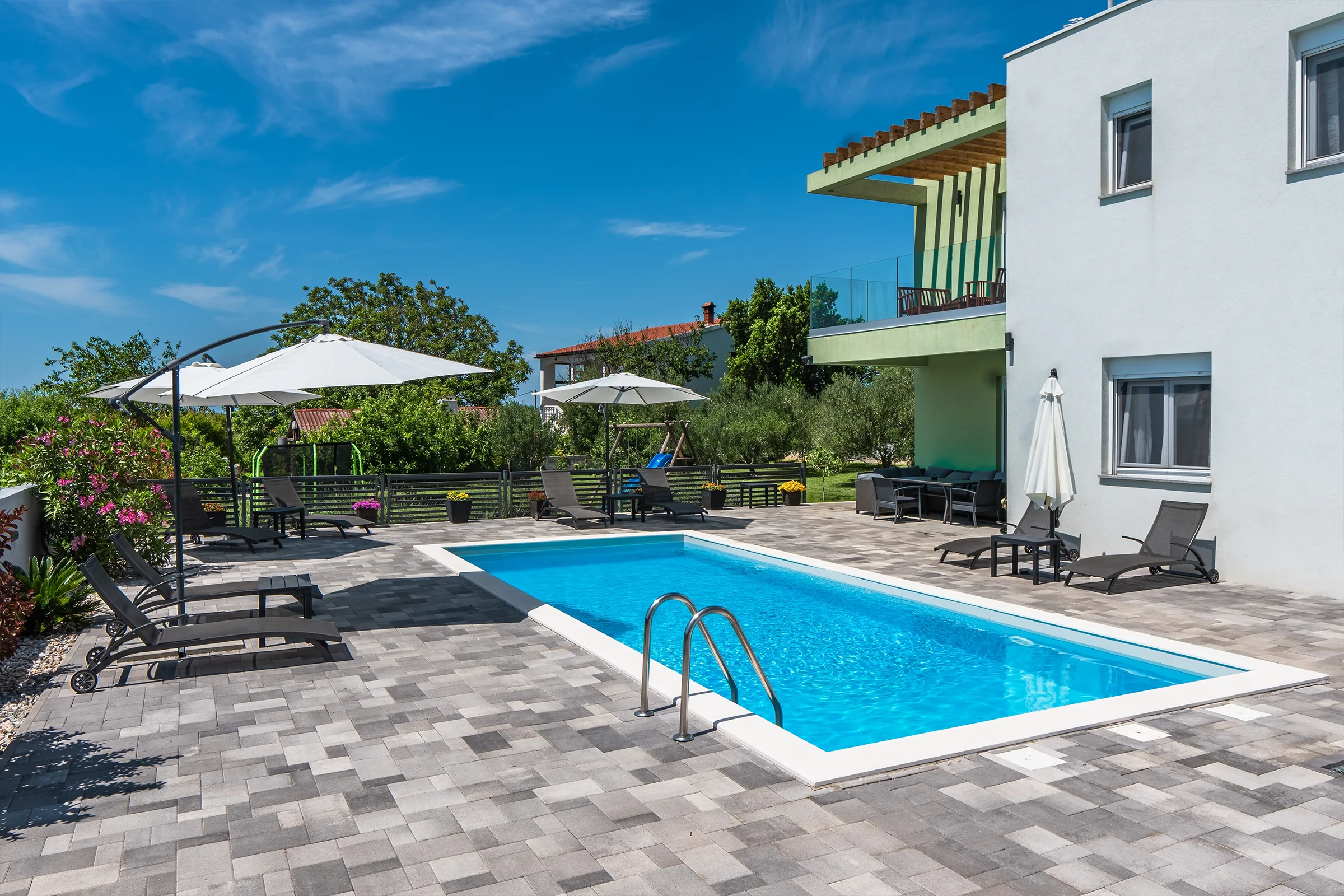 Nin Holiday Home is located in a small village Vrsi next to the picturesque town of Nin. Villa consists of a fully equipped kitchen (gas stove, oven, refrigerator with freezer, coffee machine ..), dining room and living room in one space. The living room is equipped with TV. Upstairs are 3 bedrooms with double beds and 3 bathrooms with shower, there is also a washing machine. In the outer part there is a pool with garden furniture and fenced garden with grill.