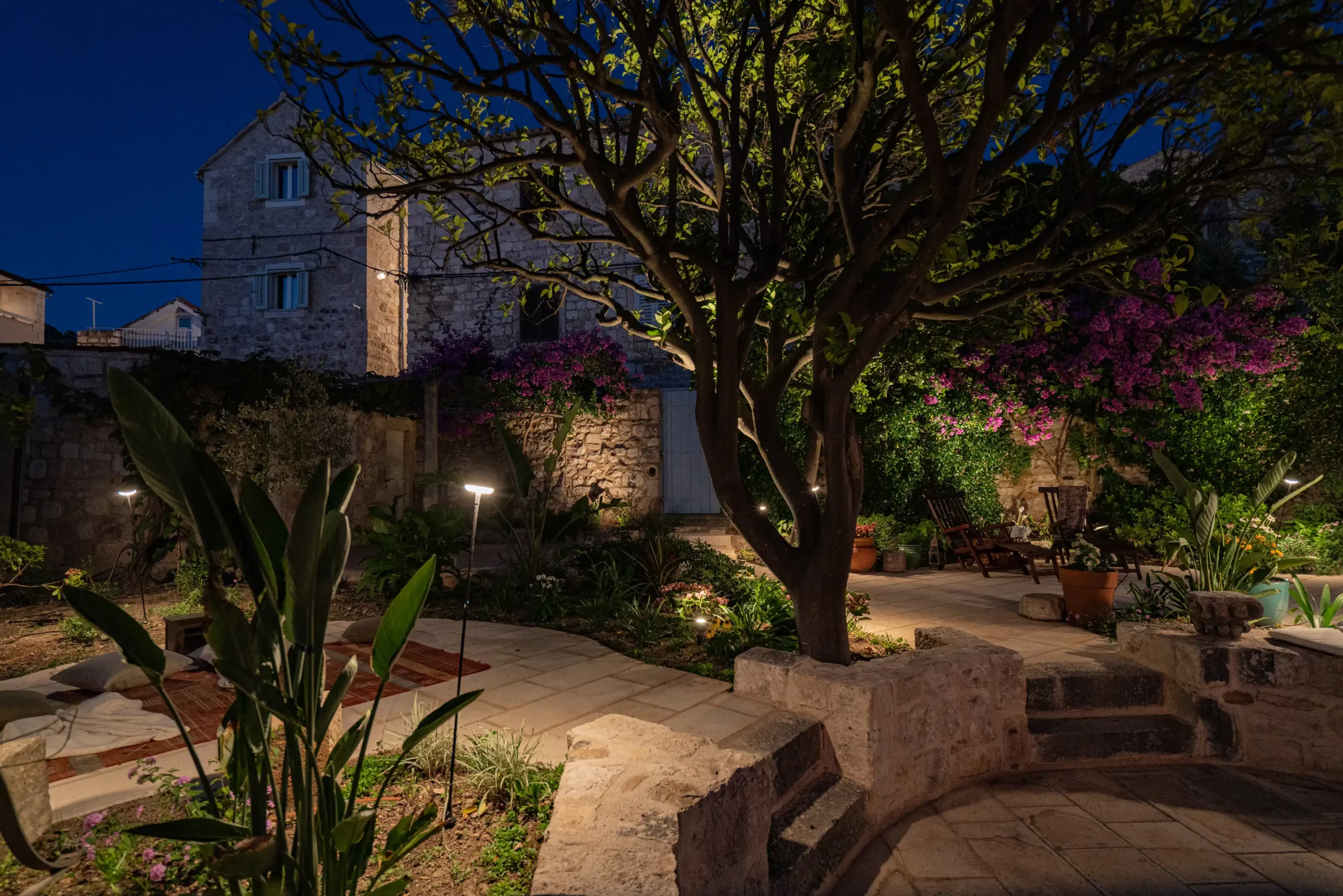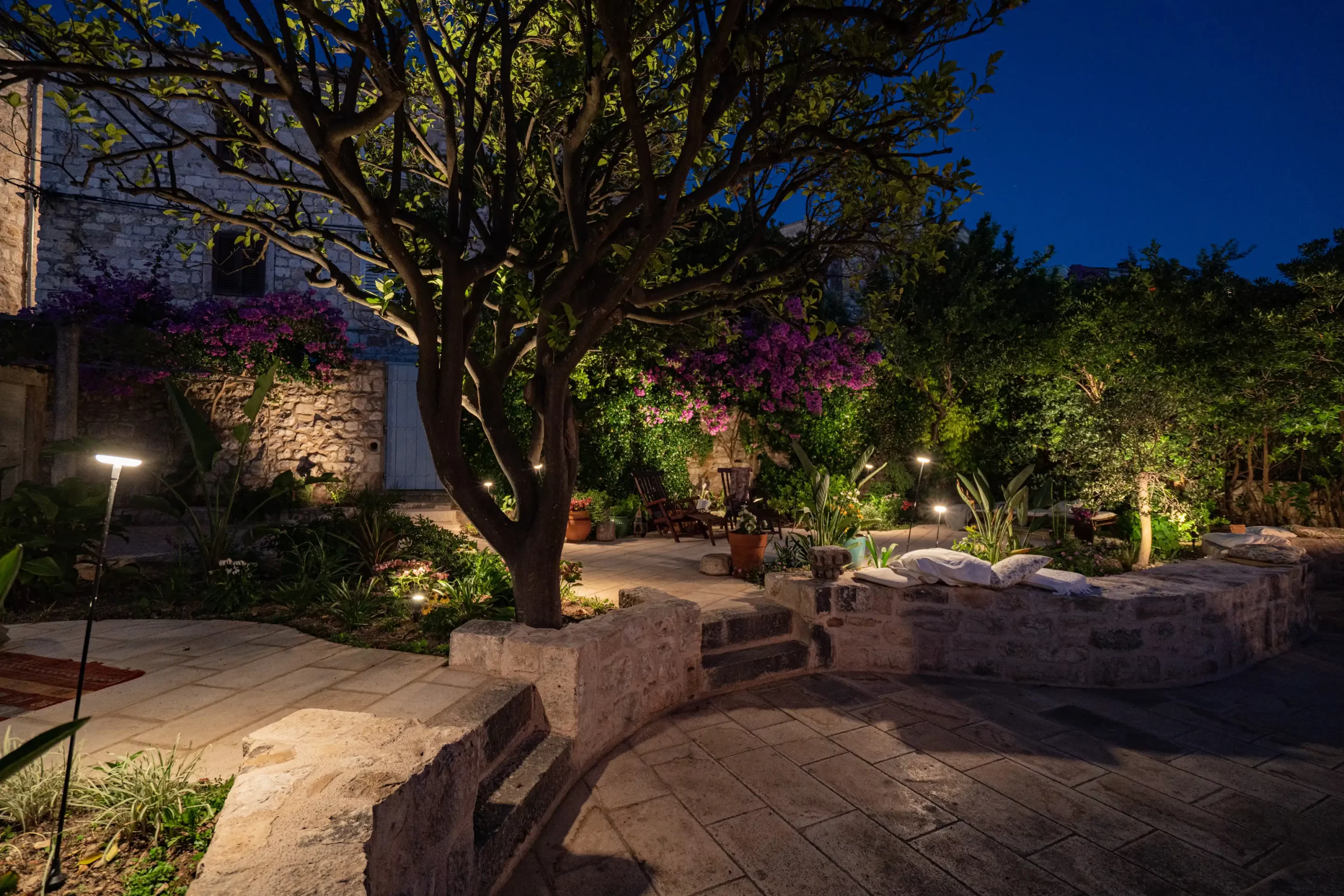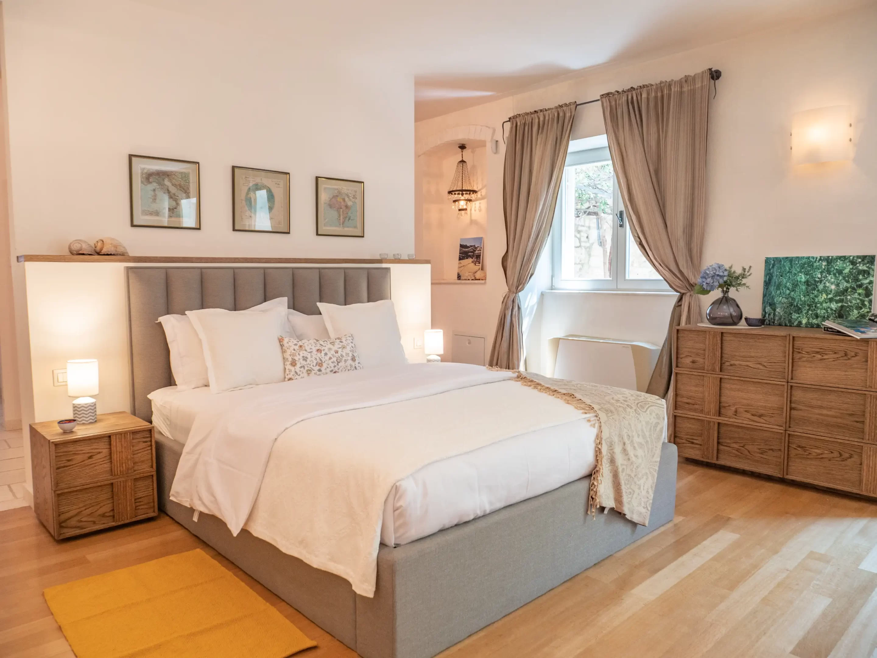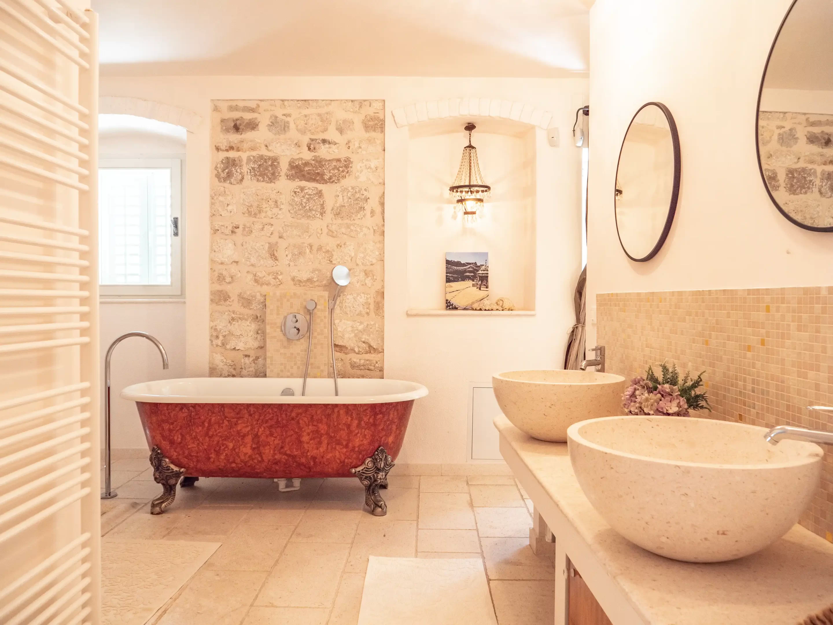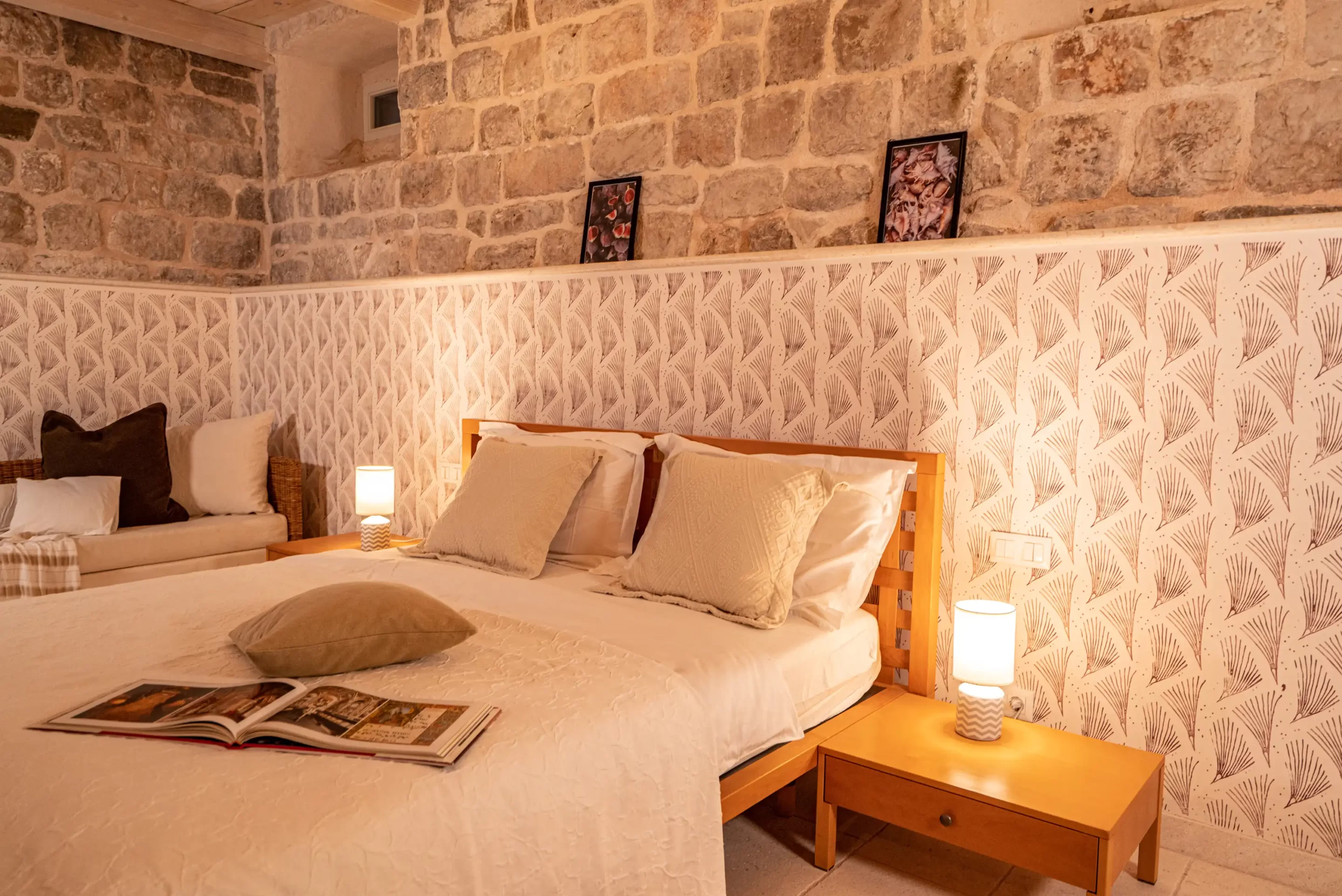 The recent refurbishment brought back the stone walls and the original feature in the ancient part, and created a light and modern family entertaining area at the top floor, with panoramic view on the sea and the ancient town.