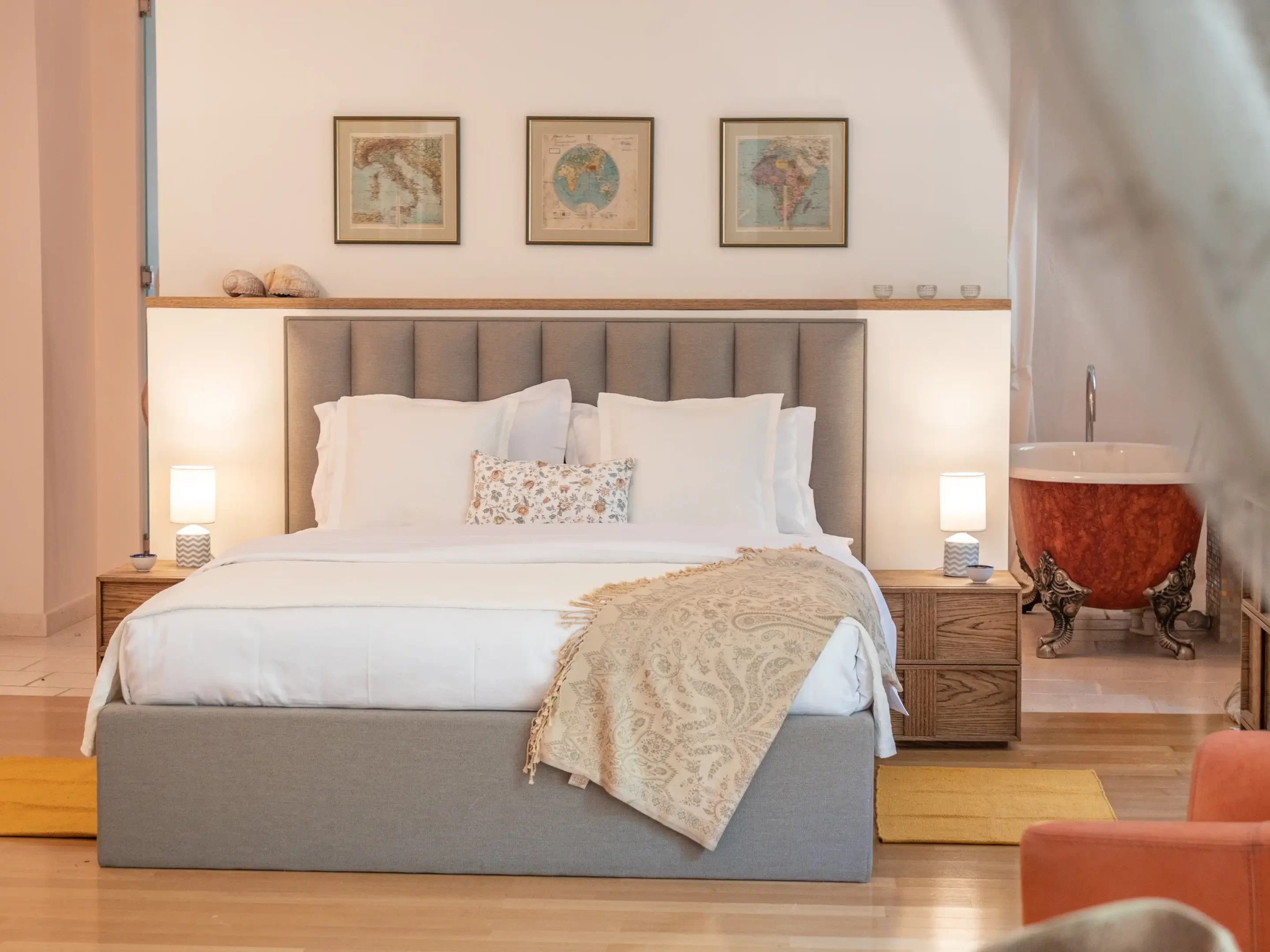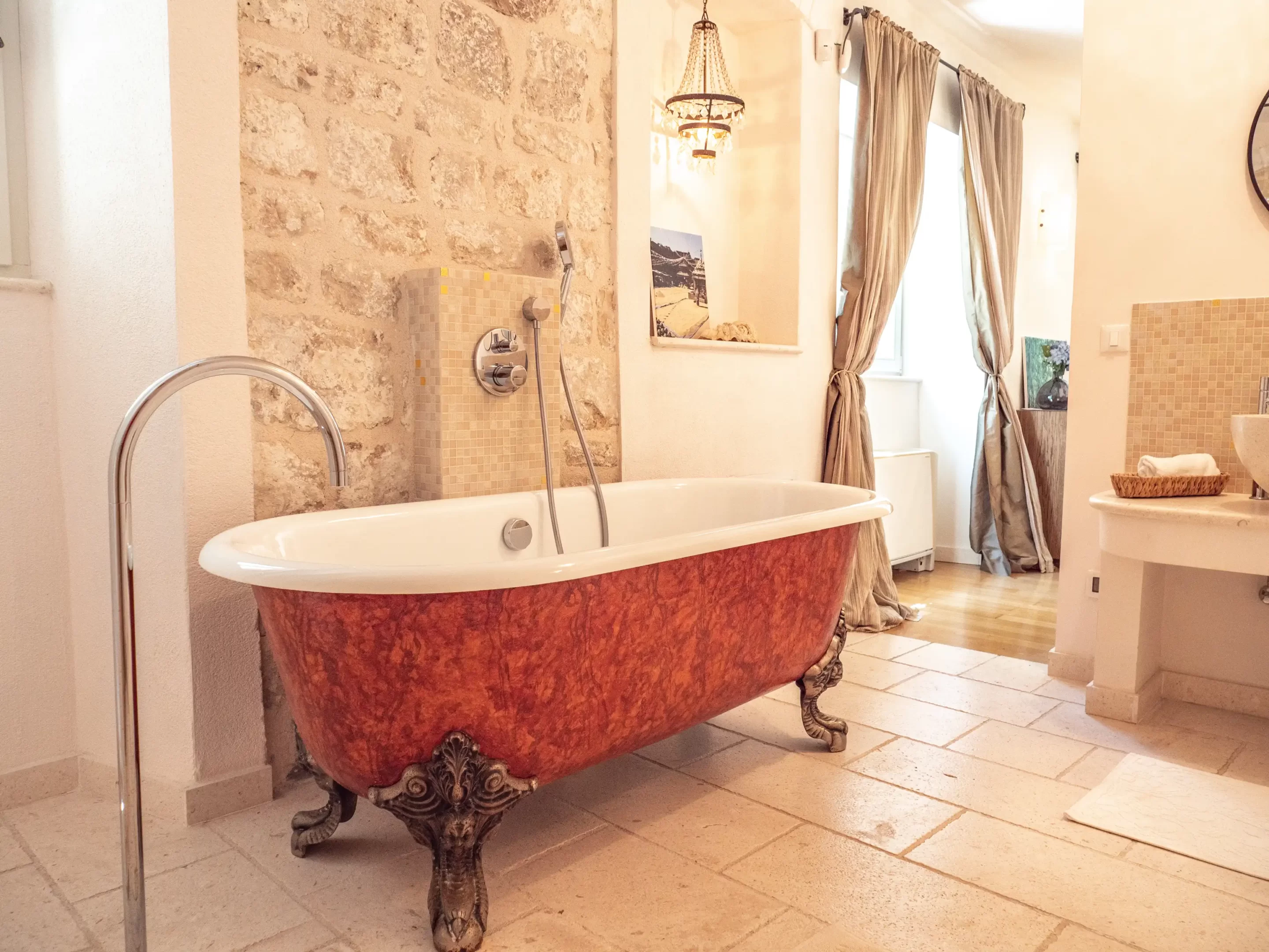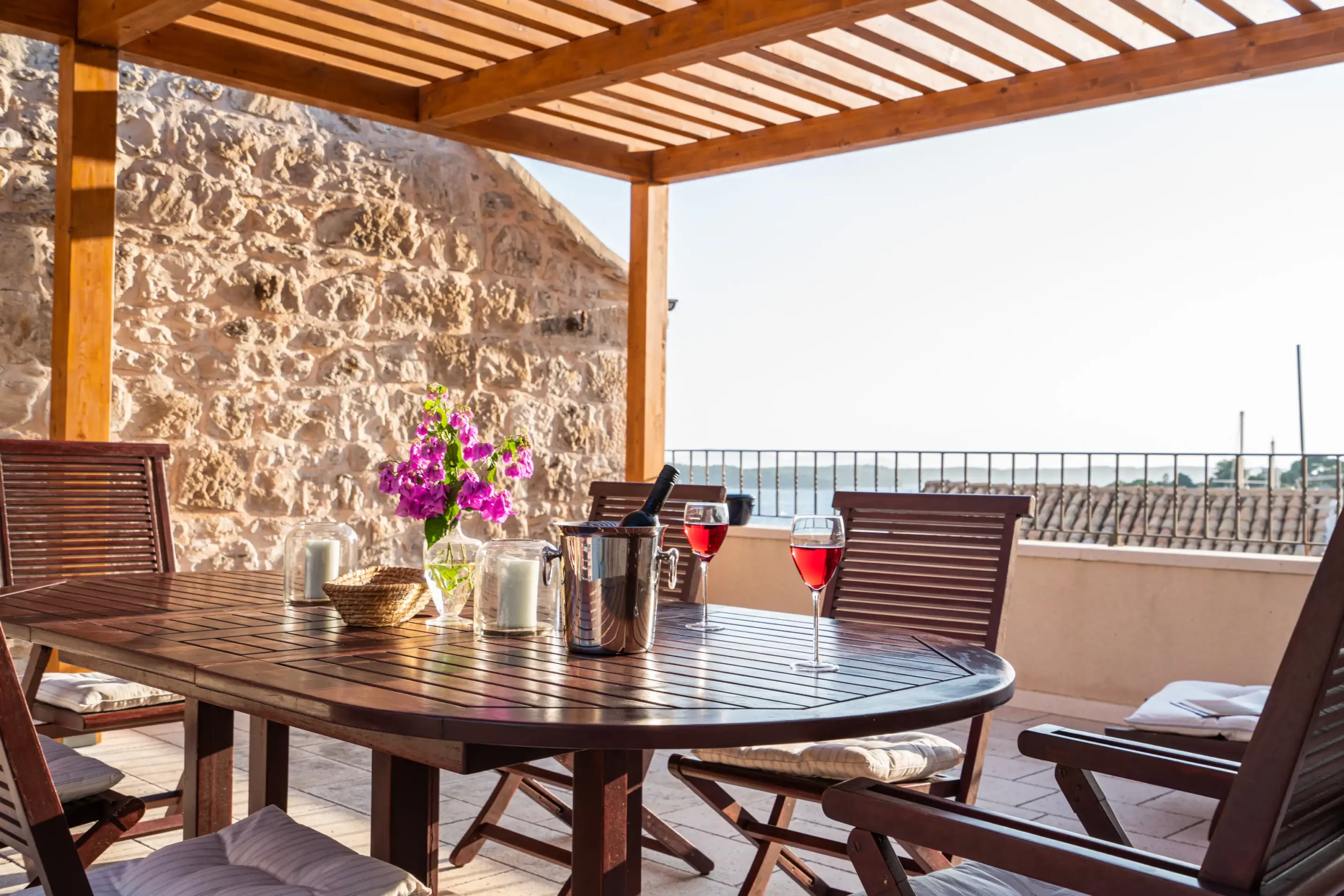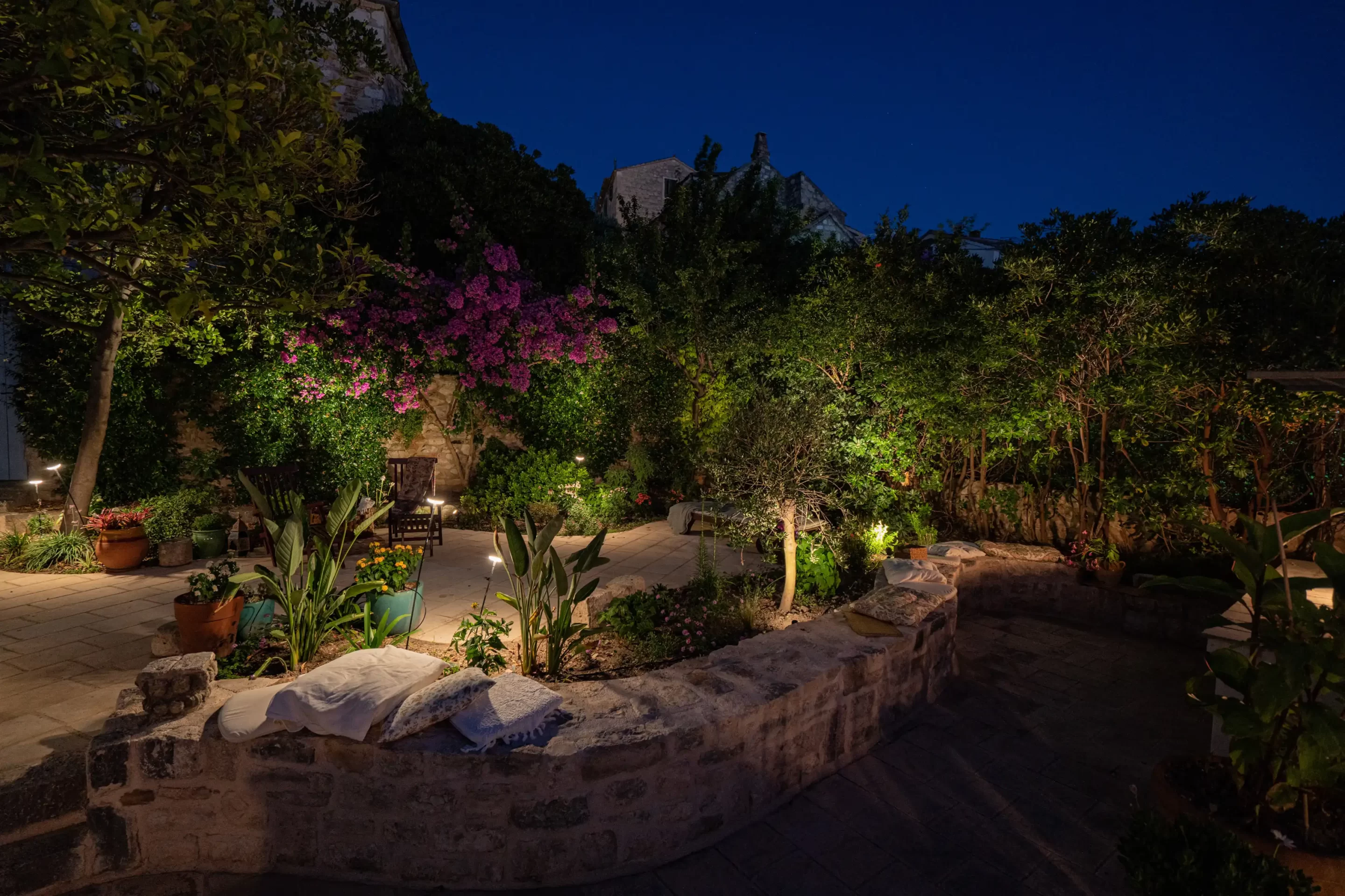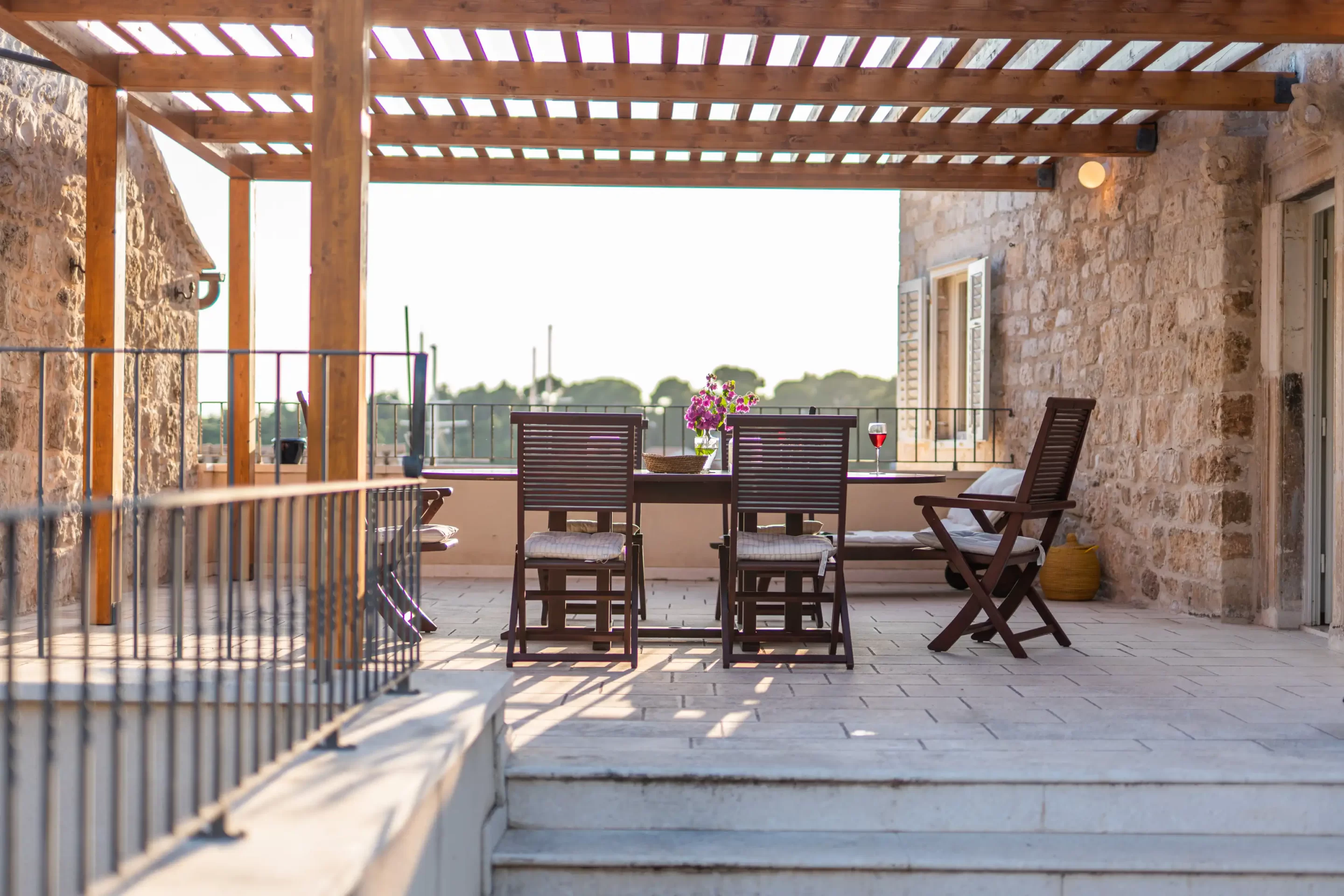 The recent refurbishment brought back the stone walls and the original feature in the ancient part, and created a light and modern family entertaining area at the top floor, with panoramic view on the sea and the ancient town.