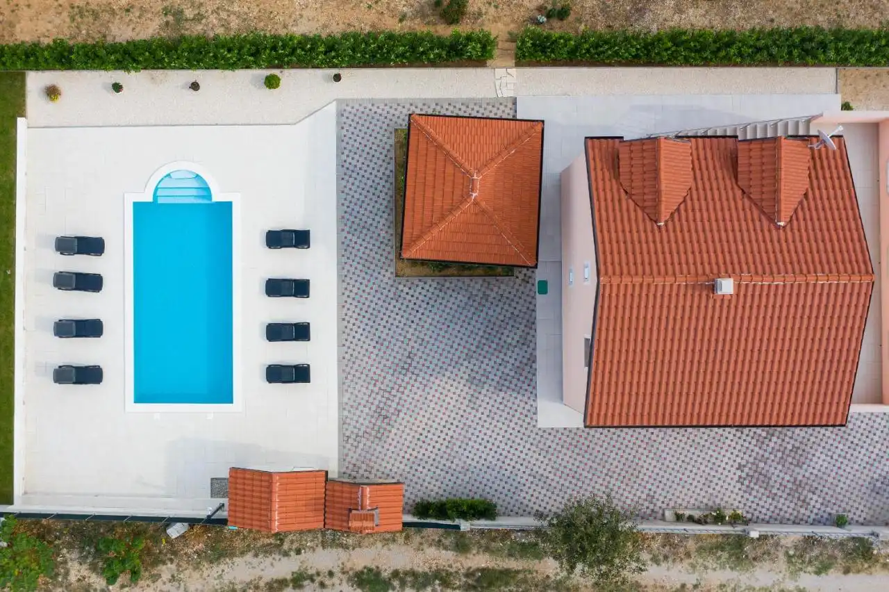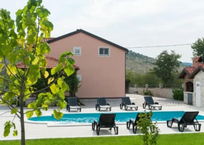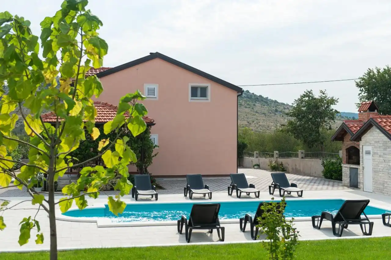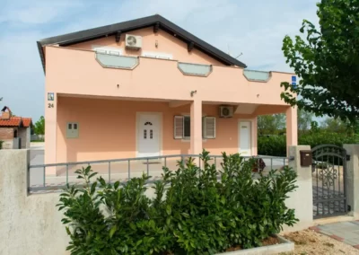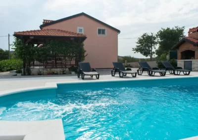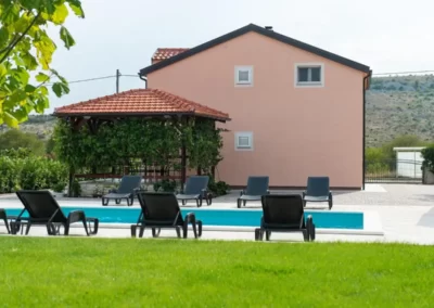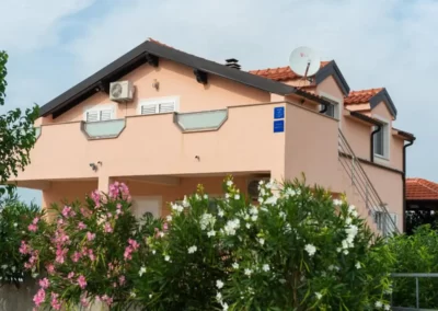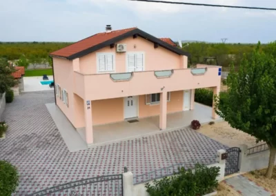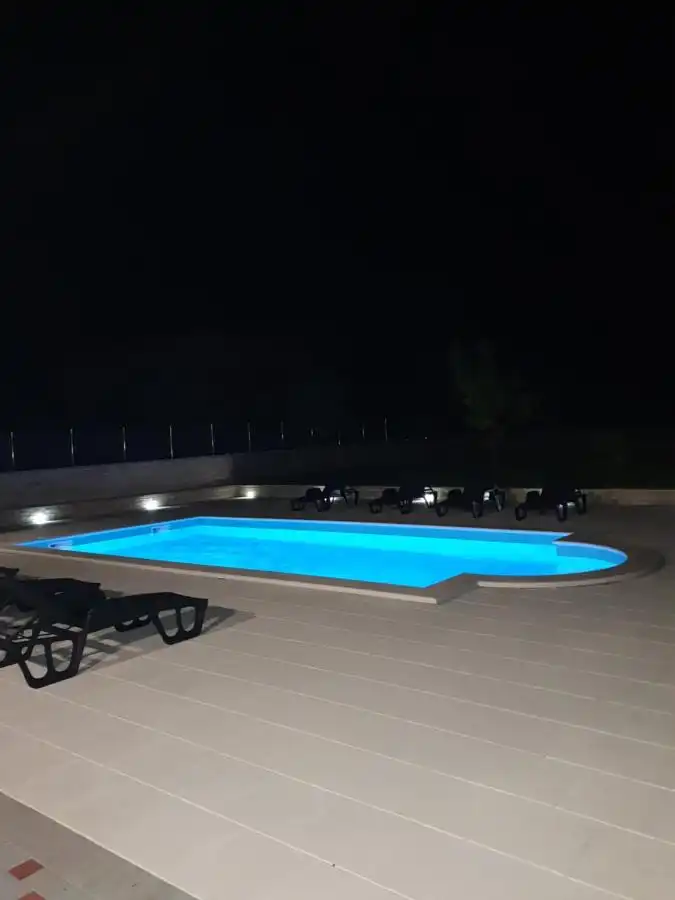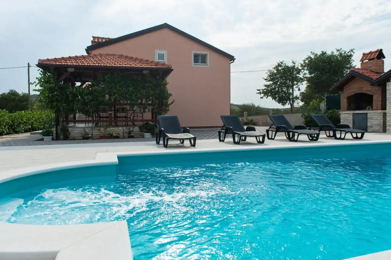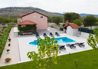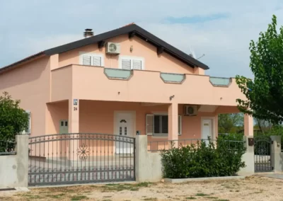 This spacious and pleasant holiday house is located in the residential part, a popular and interesting tourist destination near the Vodice and historic town of Šibenik. It consists of 2 fully equipped residential units spread over two floors, connected by an external staircase. The beautifully landscaped plot offers a variety of facilities for a fun and complete holiday, there is an outdoor pool, barbecue, canopy, deck chairs and swing.