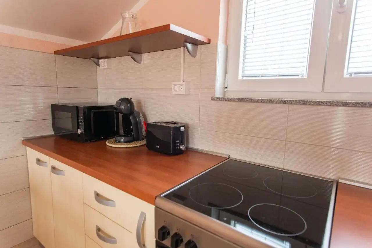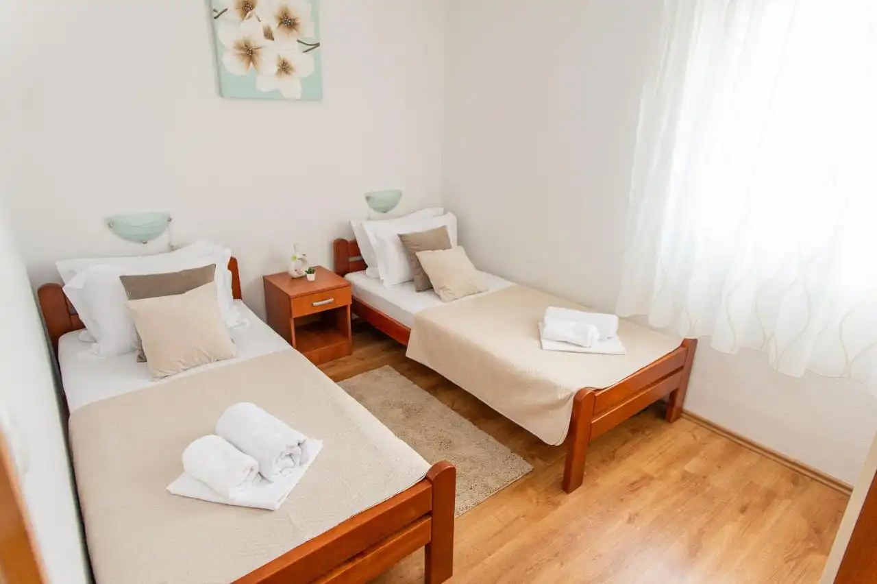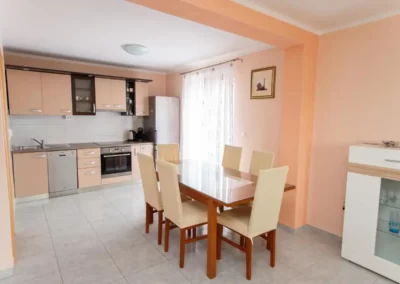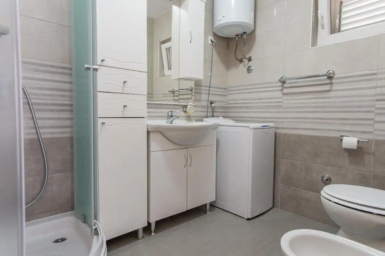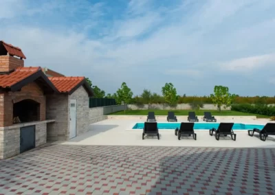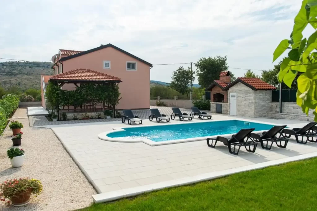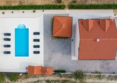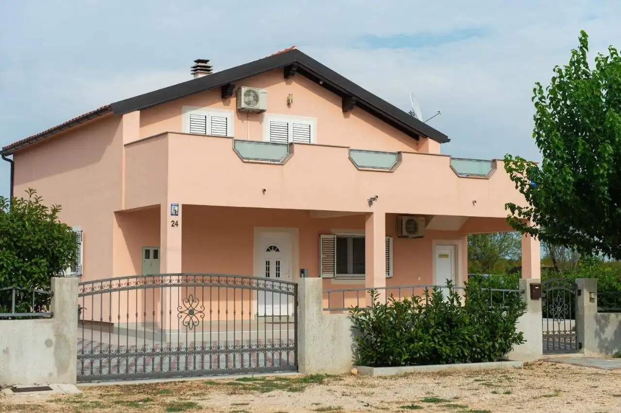 This spacious and pleasant holiday house is located in the residential part, a popular and interesting tourist destination near the Vodice and historic town of Šibenik. It consists of 2 fully equipped residential units spread over two floors, connected by an external staircase. The beautifully landscaped plot offers a variety of facilities for a fun and complete holiday, there is an outdoor pool, barbecue, canopy, deck chairs and swing.